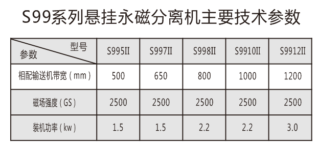 注:S95、S97、S99系列永磁分離設(shè)備,采用了高強(qiáng)磁性材料,具有磁性強(qiáng)、磁分離效果好、運(yùn)轉(zhuǎn)平穩(wěn)、